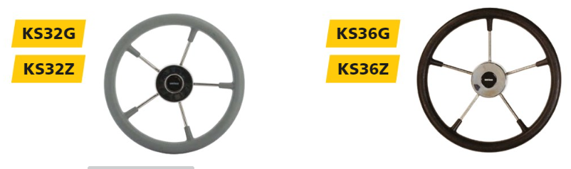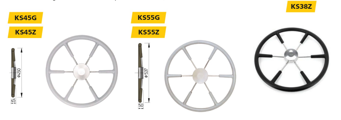 Tekniska data • Finns i diametrarna: 320, 360, 380, 450 och 550 mm • Samtliga KS-rattar finns i grått (RAL 7040) eller svart • Borrad för Ø ¾” axel med kona 1:12