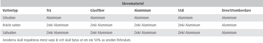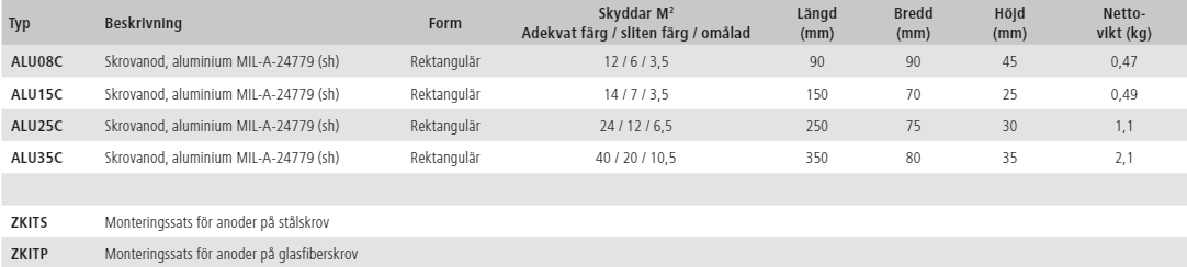 V-Quipment aluminiumanoder består av en aluminium-indium-zinklegering Mil-A-24779 (SH). Samtliga V-Quipment anoder är strömlinjeformade och monterade antingen med pinnbultar som kan svetsas till ett stålskrov eller med genomgående bult för glasfiber och träbåtar. Vi levererar dessa pinnbultar för svetsning och genomgående bultar separat. För fartyg, som för det mesta kryssar i sötvatten, rekommenderar vi aluminiumanoder eftersom aluminium har större potentialskillnad mot andra metaller än zink. Detta är mycket viktigt, eftersom färskvatten ger högre resistans än saltvatten. För segling på saltvatten eller bräckt vatten rekommenderar vi användning av zinkanoder. Aluminiumanoder fungerar också bra i saltvatten, men offras i mycket snabbare takt. Vi rekommenderar inte användning av magnesiumanoder, eftersom skillnaden i potential med andra metaller är för stor vilket kan orsaka skador på skrovfärgen, särskilt vid gång i bräckt eller saltvatten.