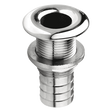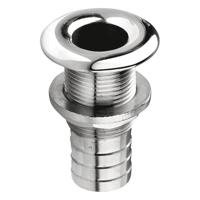 Däcksförskruvning i rostfritt stål, kullrig fläns, högglanspolerad yta, med slangsockel för slang.