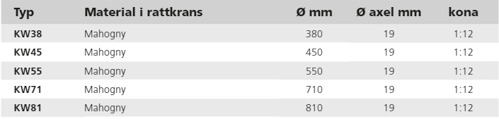 Egenskaper • KW-serien finns nu i följande diametrar: 380, 450, 550, 710 och 810 mm. • Högkvalitativ mahognyring på rostfritt stål (AISI 316) ekrar och navkapsel. • Aluminiumnavet har håldiameter 19 mm (3/4 ") med 1:12 kona som standard. Utbytesnav som passar äldre VETUS rattpumpar med Ø1 "rattaxel och 3½: 12 kona finns att tillgå från VETUS sortiment. Produktkod: SETKS1*. *Obs: Passar inte för KW71 och KW81 rattar.