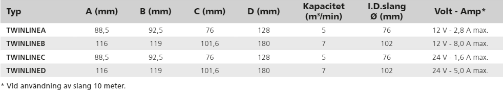 Specifikation • Uppfyller ISO 9097 Marine Standard • Slang kan kopplas till Scirocco eller Typhoon snäckventiler OBS: VETUS AVRÅDER från att använda utsugsfläktar som inloppsfläktar för huvudmotorn!