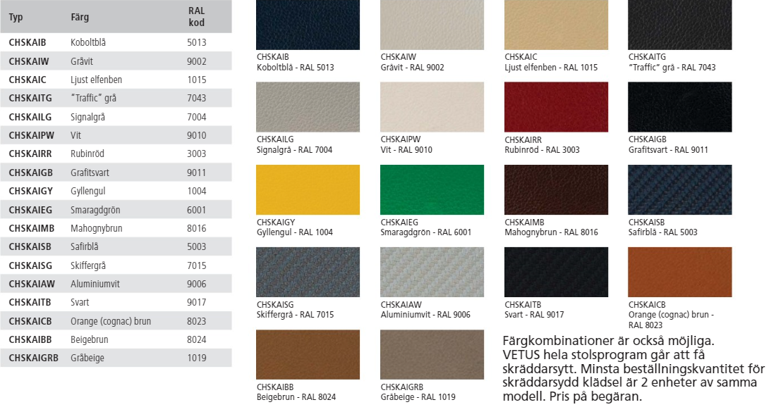 Specifikationer • Arton färger i läderimmitation av marin kvalitet • Kolfibervävning eller vanlig finish finns tillgänglig • Valfri broderad logotyp Samtliga stolar är lämpliga för det skräddarsydda stolsprogrammet, men följande flip-up stolar är tillgängliga från lager: Commander (CHCOMU), Queen (CHFUSQU), King (CHFUSKU), Master (CHFASU) och Pilot (CHSPORTU). V-Quipment stolar utan klädsel levereras med mallar för att enkelt kunna klippa ut önskat klädsel material inför sömnad. För en översikt över tillgängliga färger och deras motsvarande RAL-nummer, vänligen se nedan. Det går att beställa S.CHSKAI som prov.